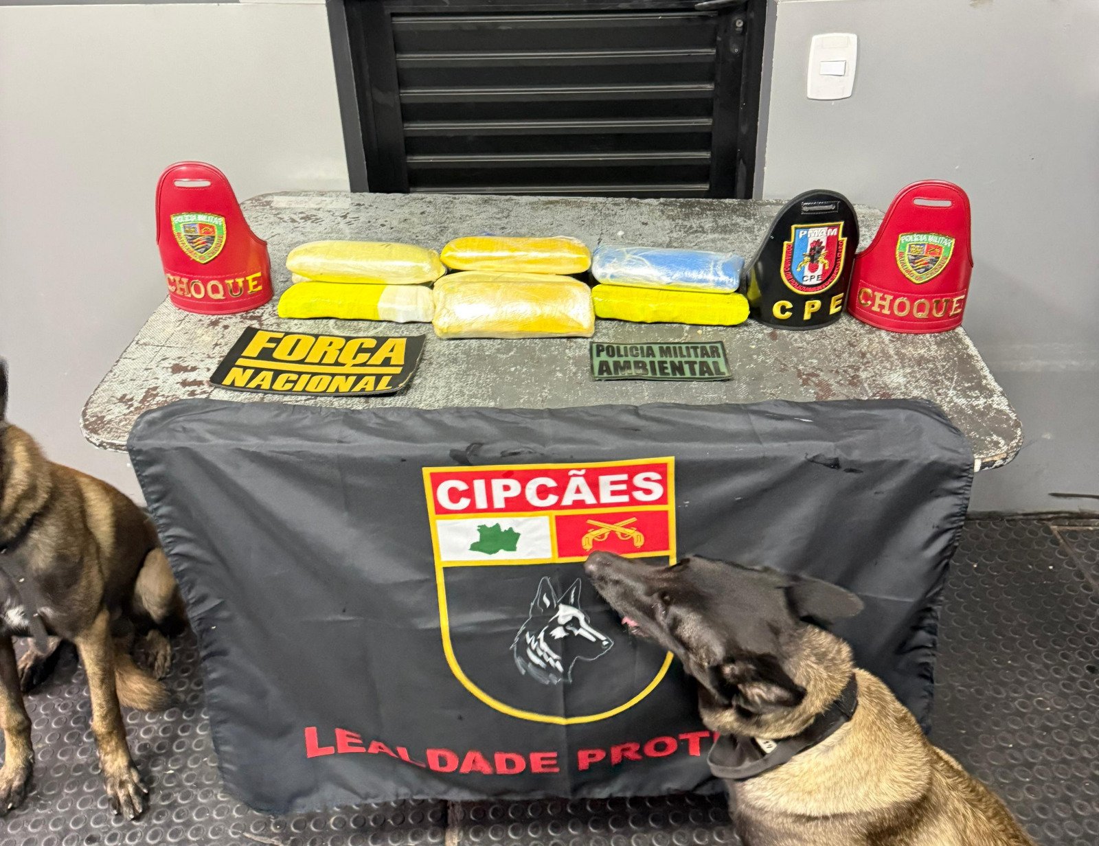 Durante fiscalização no setor de encomendas do barco, com o apoio da cadela policial Athena, foram localizados oito tabletes de pasta-base de cocaína escondidos no interior de uma caixa de papelão.