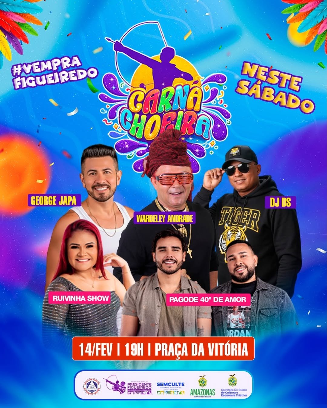 O Carnachoeira 2026 promete levantar o público com atrações que vão do pagode ao swing contagiante dos hits do momento. Sobem ao palco: