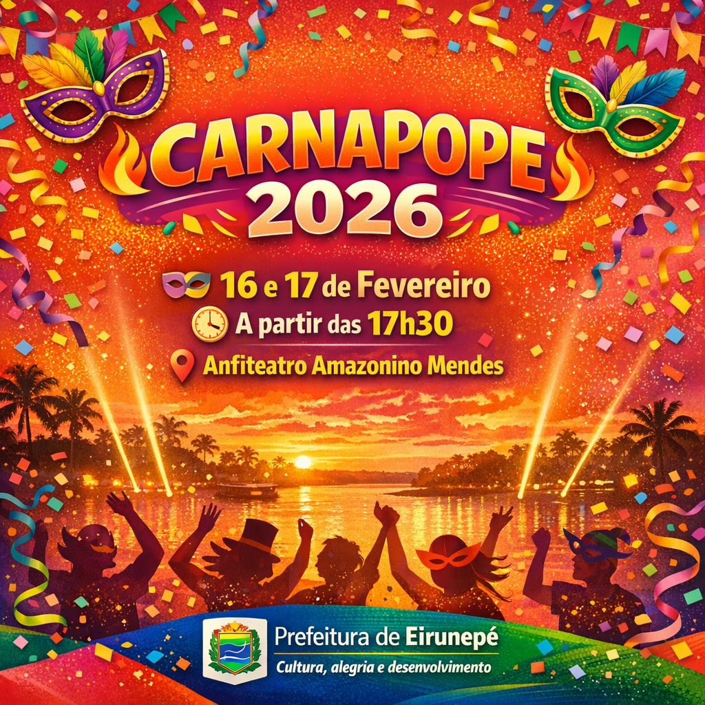 Eirunepé já está em clima de Carnaval! O Carnapope 2026 promete transformar o município em um verdadeiro palco de alegria nos dias 16 e 17 de fevereiro, a partir das 17h30, no Anfiteatro da Praça Amazonino Mendes.