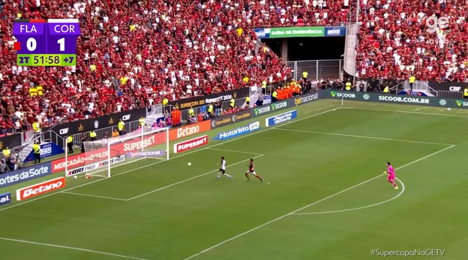 Mesmo em desvantagem numérica, o Flamengo ainda levou perigo em bolas paradas. Por outro lado, o Corinthians apostava nos contra-ataques. Já nos acréscimos, Kaio César encontrou Yuri Alberto em velocidade. O atacante aplicou um chapéu em Rossi e finalizou de cabeça para marcar o segundo gol e sacramentar o Corinthians campeão da Supercopa Rei
