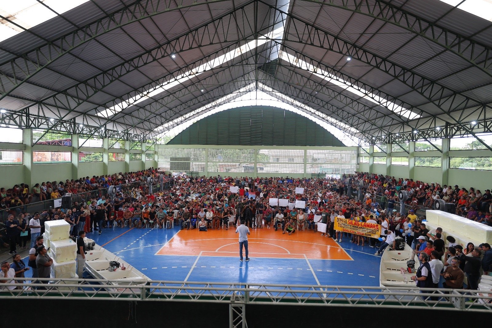 Durante o evento, realizado no ginásio Josué Araújo de Almeida, o governador deu início às entregas de implementos da nova fase do programa, com a distribuição de kits Atualiza Pescador, que incluem caixa de isopor, malhadeira, facão e chapéu, além de filtros de água potável e botes com motor rabeta às associações, colônias e sindicatos de pesca regularizados neste mês.