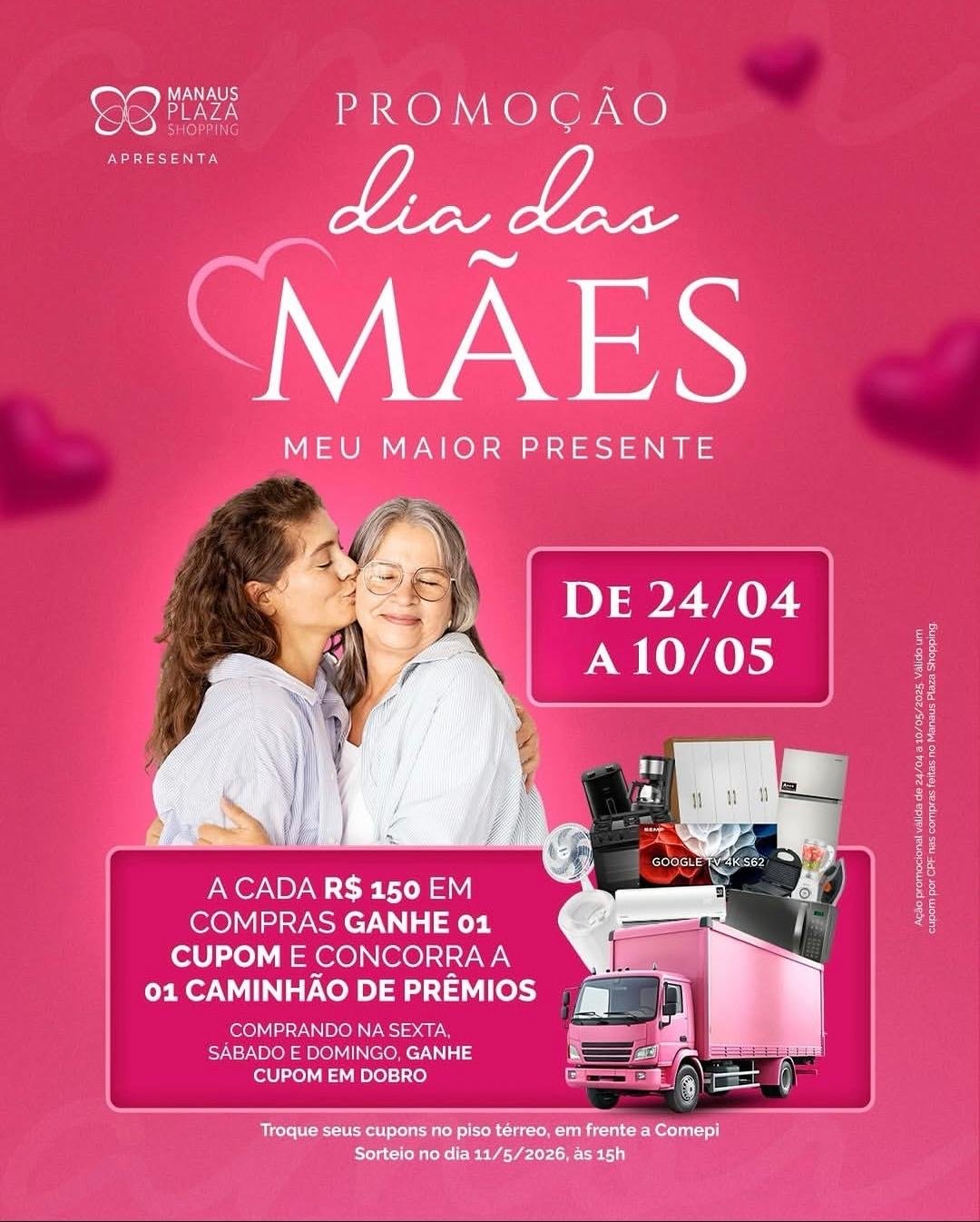 Quem pretende comprar o presente do Dia das Mães em Manaus terá um incentivo a mais neste ano. O Manaus Plaza Shopping lança a campanha “Dia das Mães Meu Maior Presente”, que vai sortear um caminhão de prêmios avaliado em R$ 10 mil. Participam os clientes que realizarem compras nas lojas, no período de 24 de abril a 10 de maio de 2026, com cupons gerados a partir das notas fiscais.