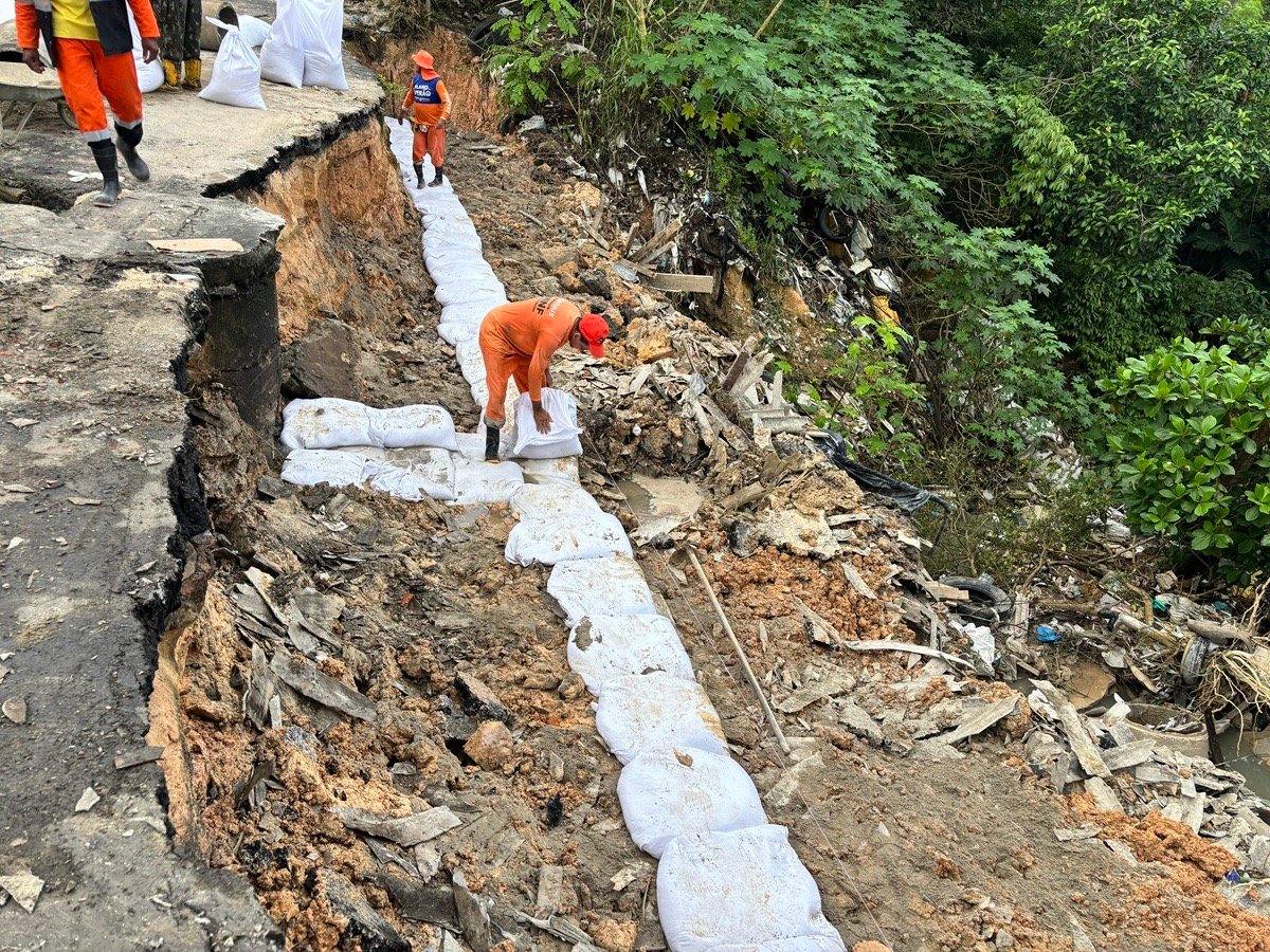 Na rua Santiago, as equipes iniciaram a contenção de um trecho da via que cedeu, agravado pelo descarte irregular de lixo. Após a limpeza completa da área, foi iniciado o processo de estabilização com rip-rap, uma técnica que utiliza sacos de cimento e areia que, ao serem umedecidas, formam uma estrutura rígida de contenção. Na sequência, será realizada a recuperação da rede de drenagem profunda e superficial, garantindo o escoamento adequado das águas pluviais e prevenindo novos deslizamentos.