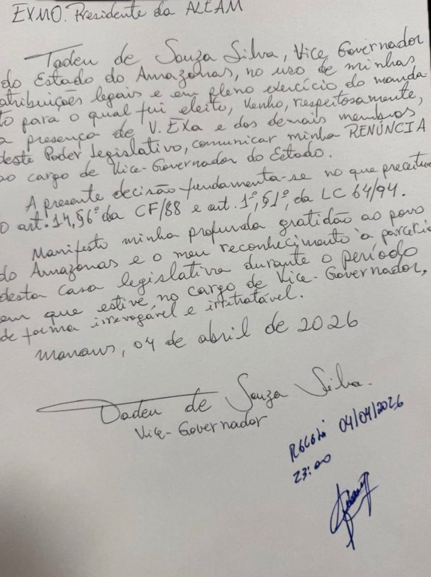 A renúncia de Wilson Lima e Tadeu no Amazonas provocou uma virada política na madrugada desta semana. O governador e o vice deixaram os cargos quase no limite do prazo eleitoral, abrindo espaço para que Roberto Cidade assuma o comando do Estado até o fim do mandato.