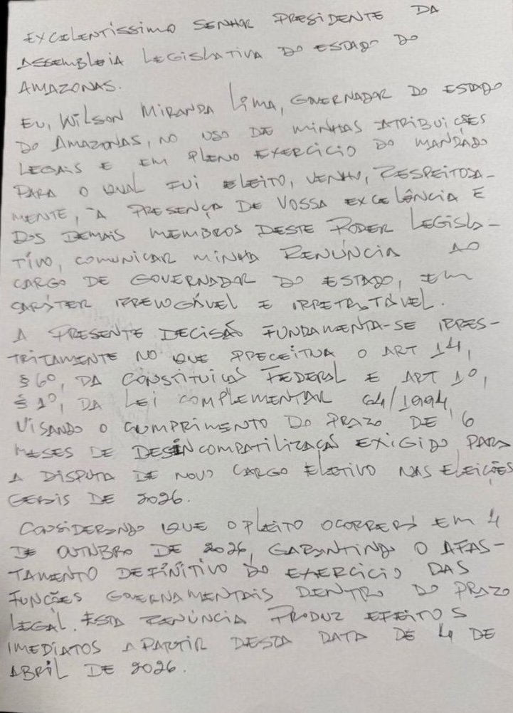 A renúncia de Wilson Lima e Tadeu no Amazonas provocou uma virada política na madrugada desta semana. O governador e o vice deixaram os cargos quase no limite do prazo eleitoral, abrindo espaço para que Roberto Cidade assuma o comando do Estado até o fim do mandato.