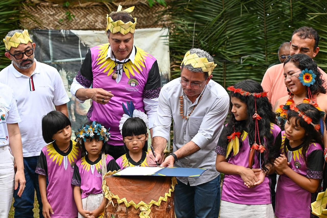O vice-governador do Amazonas, Tadeu de Souza, reafirmou o compromisso do governo Wilson Lima com o fortalecimento da educação indígena durante o lançamento do projeto de construção de 25 escolas indígenas no estado, nesta quinta-feira (26/02), em visita à comunidade indígena Sahu-Apé, em Iranduba (a 27 quilômetros de Manaus), com a presença do ministro da Educação, Camilo Santana. Durante o evento, foi realizada a assinatura do termo compromisso.